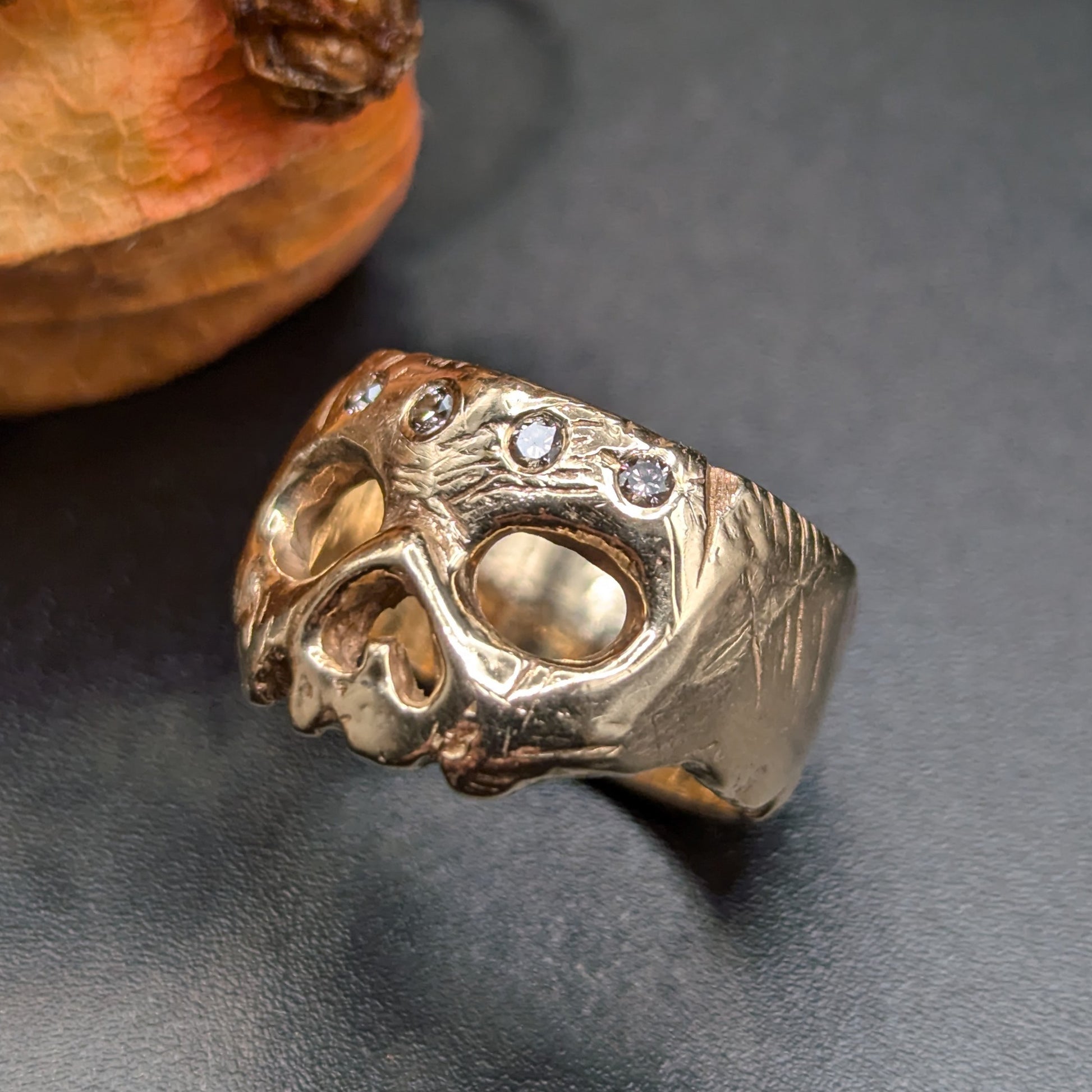 Wax carved 14kt yellow gold skull mask ring. Flush set with four beautiful 2mm champagne diamonds.